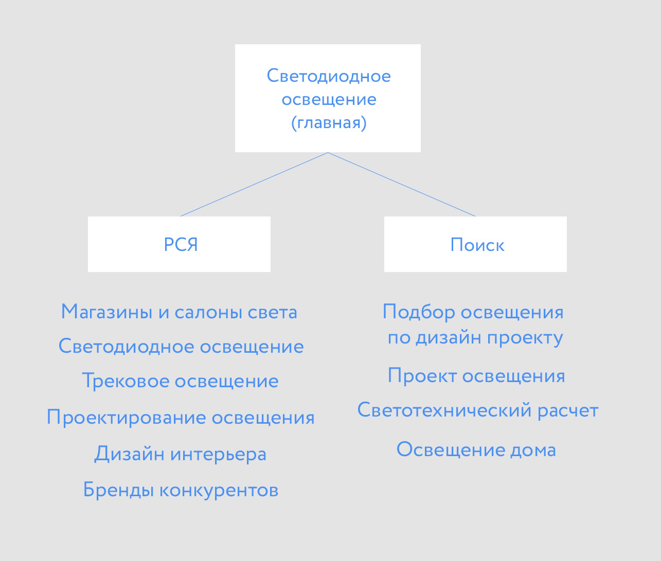На каждую страницу были настроены свои РСЯ и поисковая кампания, как это выглядело на примере главной страницы показано на схеме: